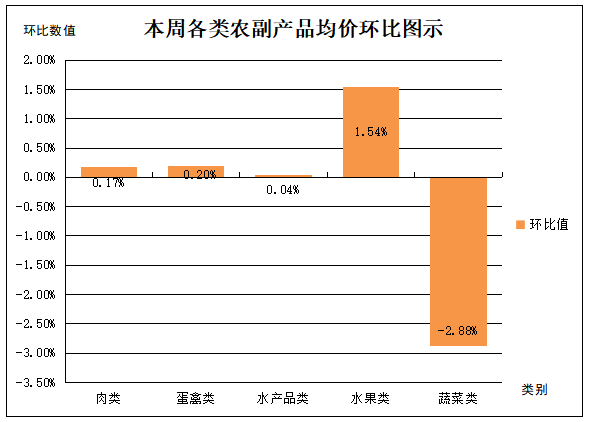 五、蔬菜类产品平均价格总体呈一定幅度回落。本周,台风天气,不利于本地蔬菜的生长和储存,外地秋冬季蔬菜已大量上市,市场蔬菜充足,价格呈季节性回落。受监测的19种蔬菜类产品平均价格呈4升15降,一定幅度回落态势。其中菜花(白花菜)平均价格回落幅度最为明显,降幅达7.75%,为价格波动之首;大白菜、白萝卜、黄瓜、空心菜等4种蔬菜平均价格分别上涨0.19%、1.78%、2.31%、3.37%;其余14种蔬菜类产品平均价格回落幅度均在7.50%以内波动。本周主要农副产品具体均价涨跌情况,详见图二。