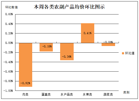 四、水果类产品总体均价微涨。本周,受监测的水果类产品中鸭梨平均价格平稳,西瓜、苹果(红富士)平均价格分别上涨0.14%和2.41%,香蕉平均价格回落4.76%,香蕉为监测水果类产品价格浮动之首。
