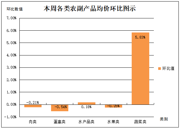 五、蔬菜类产品平均价格总体呈一定幅度上涨。本周,受北方冷空气影响,蔬菜价格有所上涨。受监测的19种蔬菜类产品平均价格呈16升3降,一定幅度上涨态势。其中黄瓜平均价格上涨幅度最为明显,涨幅达18.65%,为价格波动之首;空心菜、油菜平均价格上涨幅度超过15.00%,涨幅分别为17.14%和17.79%;菜花(白花菜)、圆白菜(包菜)、青椒平均价格分别回落0.21%、2.74%、3.23%;其余13种蔬菜类产品平均价格上涨幅度均在12.00%以内波动。本周主要农副产品具体均价涨跌情况,详见图二。