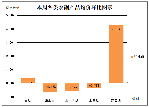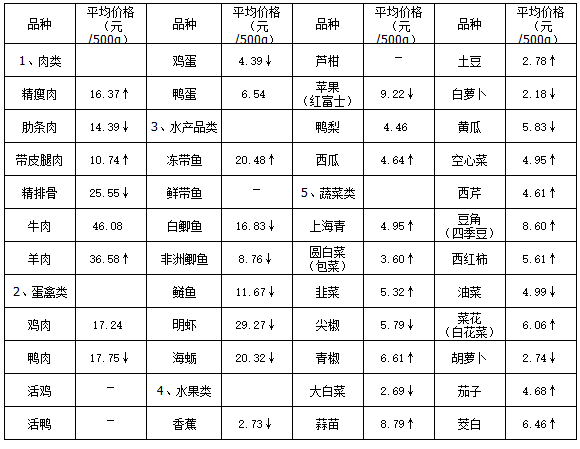 五、蔬菜类产品平均价格总体呈一定幅度上涨。本周,受北方冷空气影响,蔬菜价格有所上涨。受监测的19种蔬菜类产品平均价格呈13升6降,一定幅度上涨态势。其中空心菜平均价格上涨幅度最为明显,涨幅达13.74%,为价格波动之首;尖椒、黄瓜、胡萝卜、大白菜、油菜、白萝卜等6种蔬菜平均价格分别回落0.13%、0.42%、0.66%、3.17%、3.32%、12.48%;其余12种蔬菜类产品平均价格上涨幅度均在13.60%以内波动。本周主要农副产品具体均价涨跌情况,详见图二。