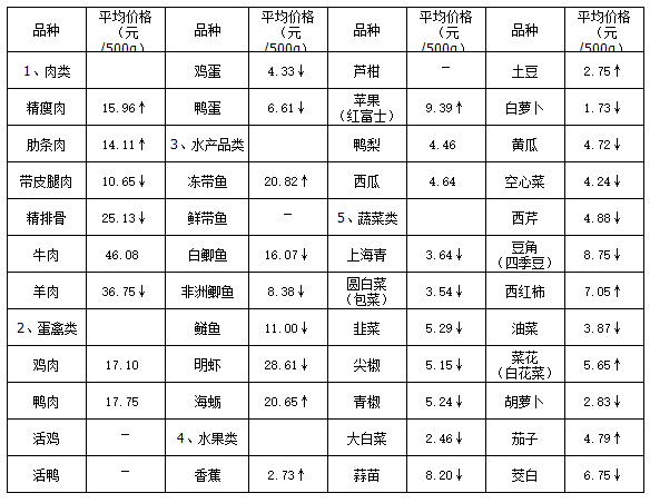 五、蔬菜类产品平均价格总体微降。本周,受监测的19种蔬菜类产品平均价格呈4升15降,微幅回落态势。其中西红柿平均价格上涨幅度最为明显,涨幅达17.61%,为价格波动之首;菜花(白花菜)、土豆、茄子等3种蔬菜平均价格分别上涨0.85%、3.31%、3.95%;其余15种蔬菜类产品平均价格回落幅度均在12.50%以内波动。本周主要农副产品具体均价涨跌情况,详见图二。