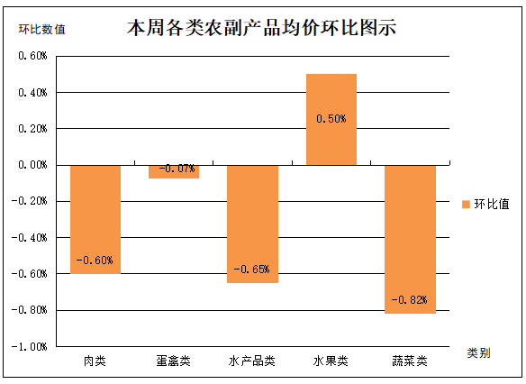 四、水果类产品总体均价微涨。本周,受监测的水果类产品中鸭梨、西瓜平均价格平稳,苹果(红富士)、香蕉平均价格分别上涨0.60%和1.89%,香蕉为监测水果类产品价格浮动之首。