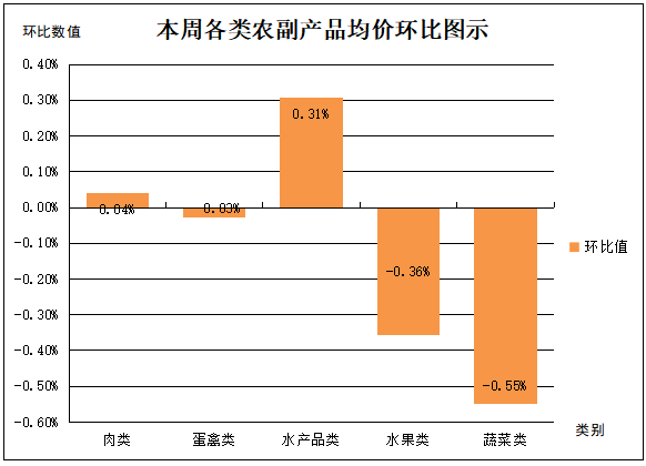 四、水果类产品总体均价微降。本周,受监测的水果类产品中苹果(红富士)、鸭梨、西瓜平均价格平稳,香蕉平均价格呈一定幅度回落,降幅为2.84%,香蕉为监测水果类产品价格浮动之首。