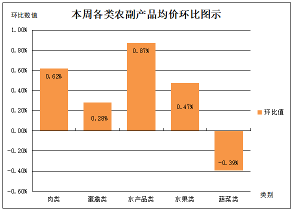 三、水产品类产品总体均价微涨。本周,受监测的水产品类产品中海蛎、白鲫鱼、非洲鲫鱼平均价格分别回落0.45%、1.43%、2.70%,明虾、鲢鱼、冻带鱼平均价格分别上涨0.94%、1.44%、4.97%,冻带鱼为监测水产品类产品价格浮动之首。