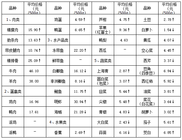 五、蔬菜类产品平均价格总体微降。冬季蔬菜逐渐上市,蔬菜价格有所回落。本周,受监测的19种蔬菜类产品平均价格呈10升9降,微幅回落态势。其中西芹平均价格回落幅度最为明显,降幅达12.25%,为价格波动之首;青椒、黄瓜、大白菜、豆角(四季豆)、蒜苗、西红柿、白萝卜、菜花(白花菜)等8种蔬菜平均价格分别回落0.56%、0.59%、0.60%、2.25%、6.02%、8.06%、9.28%、9.64%;其余10种蔬菜类产品平均价格上涨幅度均在12.00%以内波动。本周主要农副产品具体均价涨跌情况,详见图二。