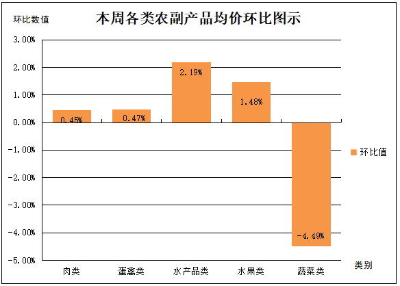 五、蔬菜类产品平均价格总体呈一定幅度回落。冬季蔬菜逐渐上市,蔬菜价格有所回落。本周,受监测的19种蔬菜类产品平均价格呈4升15降,一定幅度回落态势。其中茄子平均价格回落幅度最为明显,降幅达20.06%,为价格波动之首;西红柿回落幅度超过15.00%,降幅为18.98%;茭白、空心菜、韭菜、豆角(四季豆)等4种蔬菜平均价格分别上涨0.10%、1.80%、2.38%、5.14%;其余13种蔬菜类产品平均价格回落幅度均在14.00%以内波动。本周主要农副产品具体均价涨跌情况,详见图二。