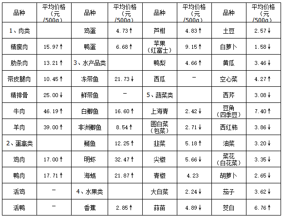 三、水产品类产品总体均价呈一定幅度上涨。本周,临近春节,水产品需求增加,价格波动较大。受监测的水产品类产品中冻带鱼平均价格回落2.98%,海蛎、白鲫鱼、非洲鲫鱼、鲢鱼、明虾平均价格分别上涨1.32%、3.23%、4.04%、4.26%、4.73%,明虾为监测水产品类产品价格浮动之首。
