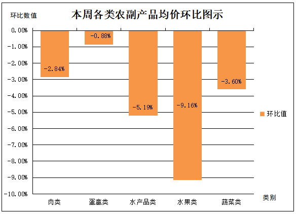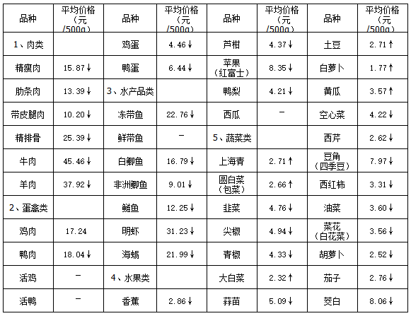 五、蔬菜类产品平均价格总体呈一定幅度回落。本周,受监测的19种蔬菜类产品平均价格呈6升13降,一定幅度回落态势。其中青椒平均价格回落幅度最为明显,降幅达12.52%,为价格波动之首;上海青、土豆、圆白菜(包菜)、黄瓜、白萝卜、大白菜等6种蔬菜平均价格分别上涨0.08%、0.45%、1.11%、1.28%、3.81%、6.32%;其余12种蔬菜类产品平均价格回落幅度均在11.50%以内波动。本周主要农副产品具体均价涨跌情况,详见图二。