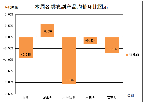 三、水产品类产品总体均价呈一定幅度回落。本周,受监测的水产品类产品中冻带鱼平均价格平稳,白鲫鱼、鲢鱼、非洲鲫鱼、海蛎、明虾平均价格分别不同幅度回落0.28%、0.53%、1.59%、3.38%、4.36%,明虾为监测水产品类产品价格浮动之首。