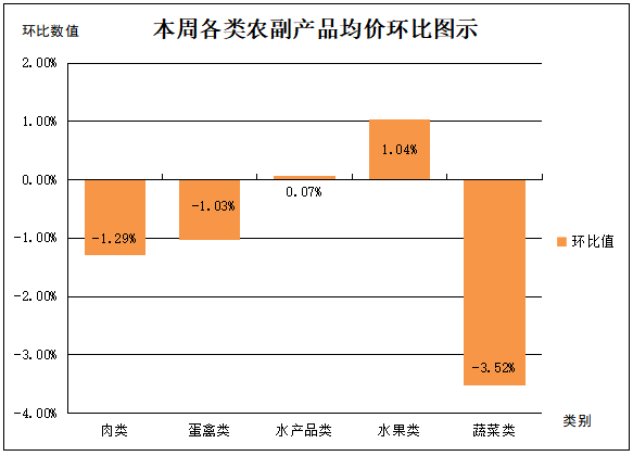 四、水果类产品总体均价小幅上涨。本周,受监测的水果类产品中鸭梨平均价格平稳,香蕉平均价格小幅回落1.03%,芦柑、苹果(红富士)平均价格分别小幅上涨1.79%和1.88%,苹果(红富士)为监测水果类产品价格浮动之首。