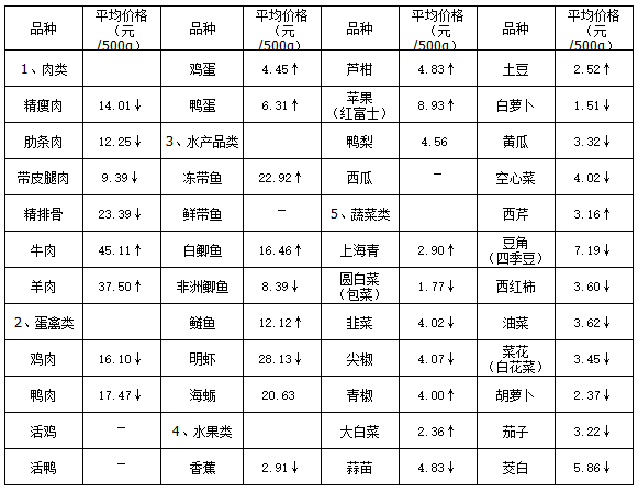 五、蔬菜类产品平均价格总体呈一定幅度回落。本周,受监测的19种蔬菜类产品平均价格呈5升14降,一定幅度回落态势。其中圆白菜(包菜)平均价格回落幅度最为明显,降幅达22.25%,为价格波动之首;空心菜回落幅度超过15.00%,降幅为15.04%;大白菜、土豆、青椒、西芹、上海青等5种蔬菜平均价格分别上涨1.43%、1.95%、4.87%、7.88%、8.66%;其余12种蔬菜类产品平均价格回落幅度均在14.50%以内波动。本周主要农副产品具体均价涨跌情况,详见图二。