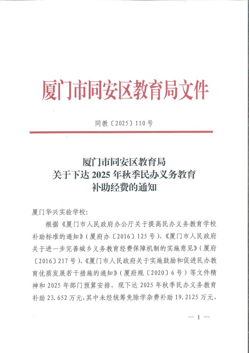 关于下达2025年秋季民办义务教育补助经费的通知(同教〔2025〕110号)