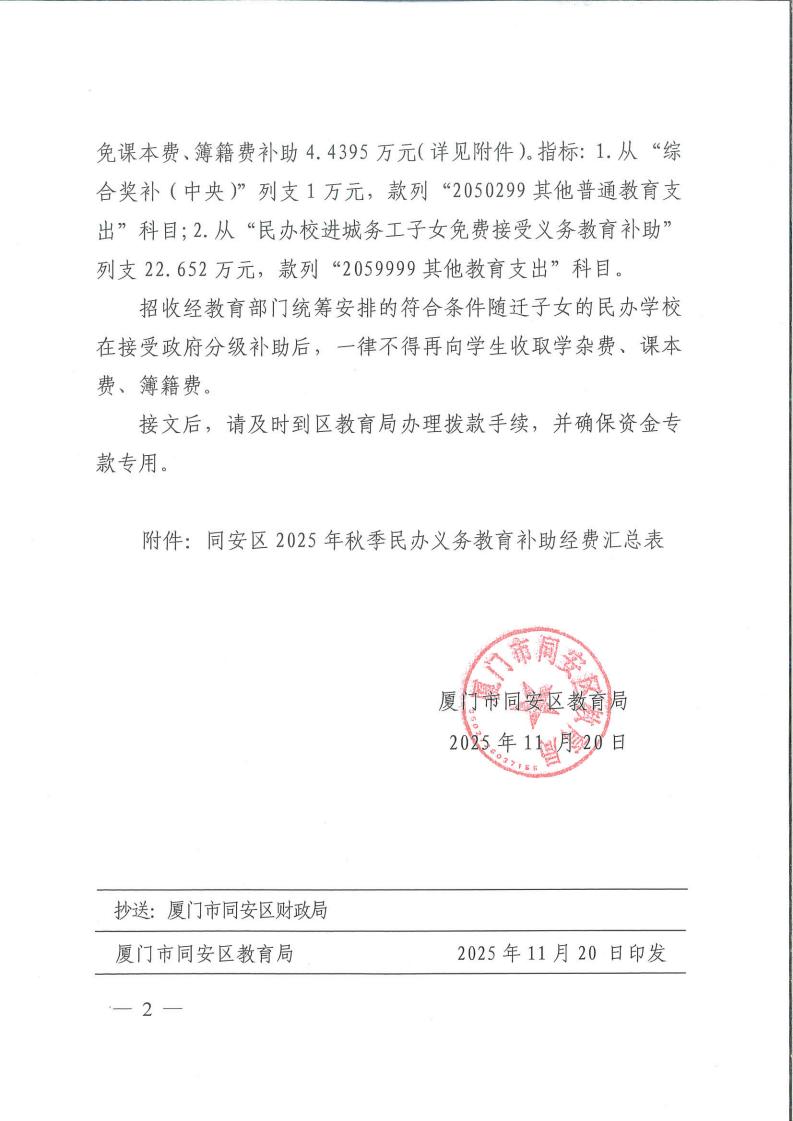关于下达2025年秋季民办义务教育补助经费的通知(同教〔2025〕110号)