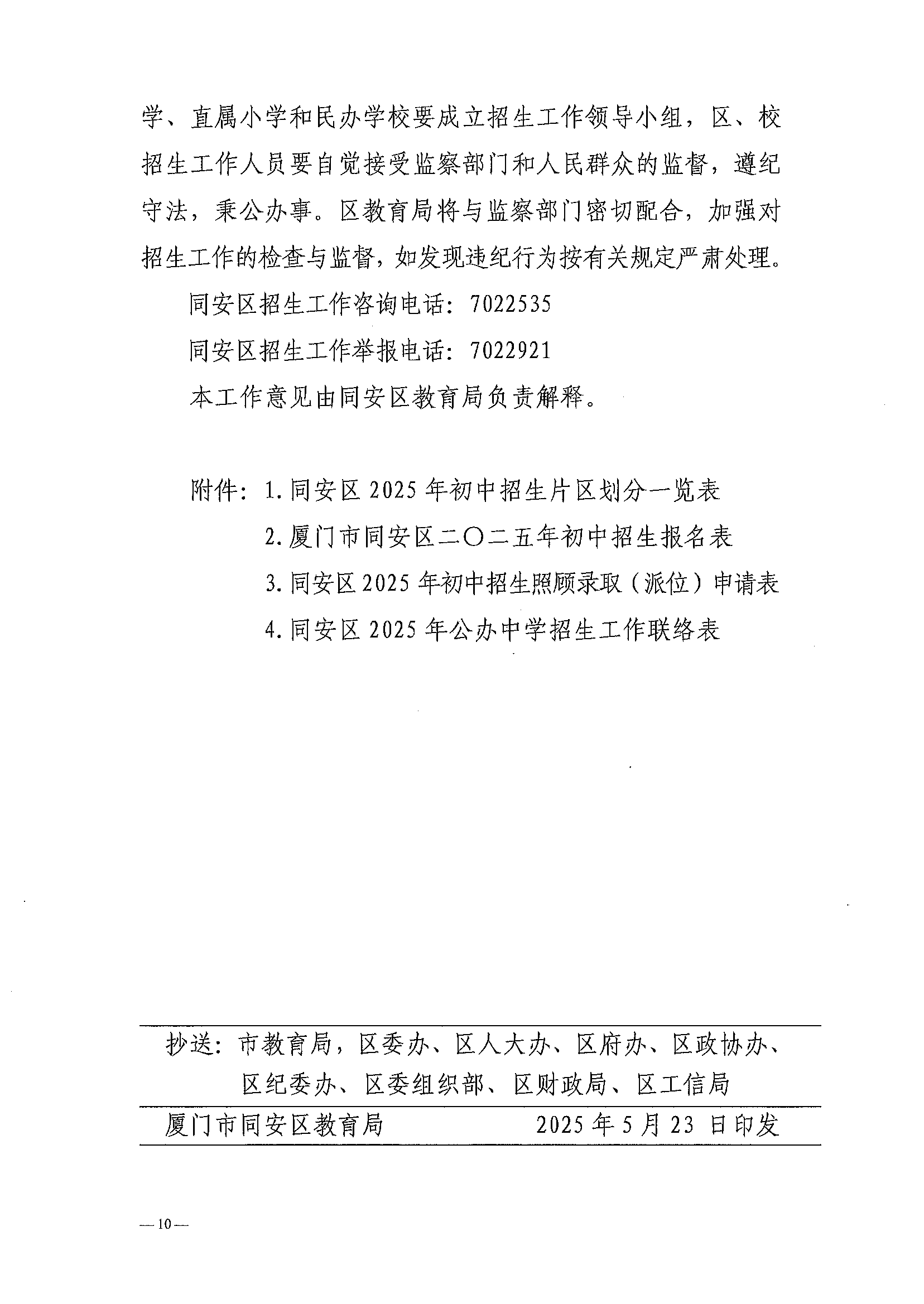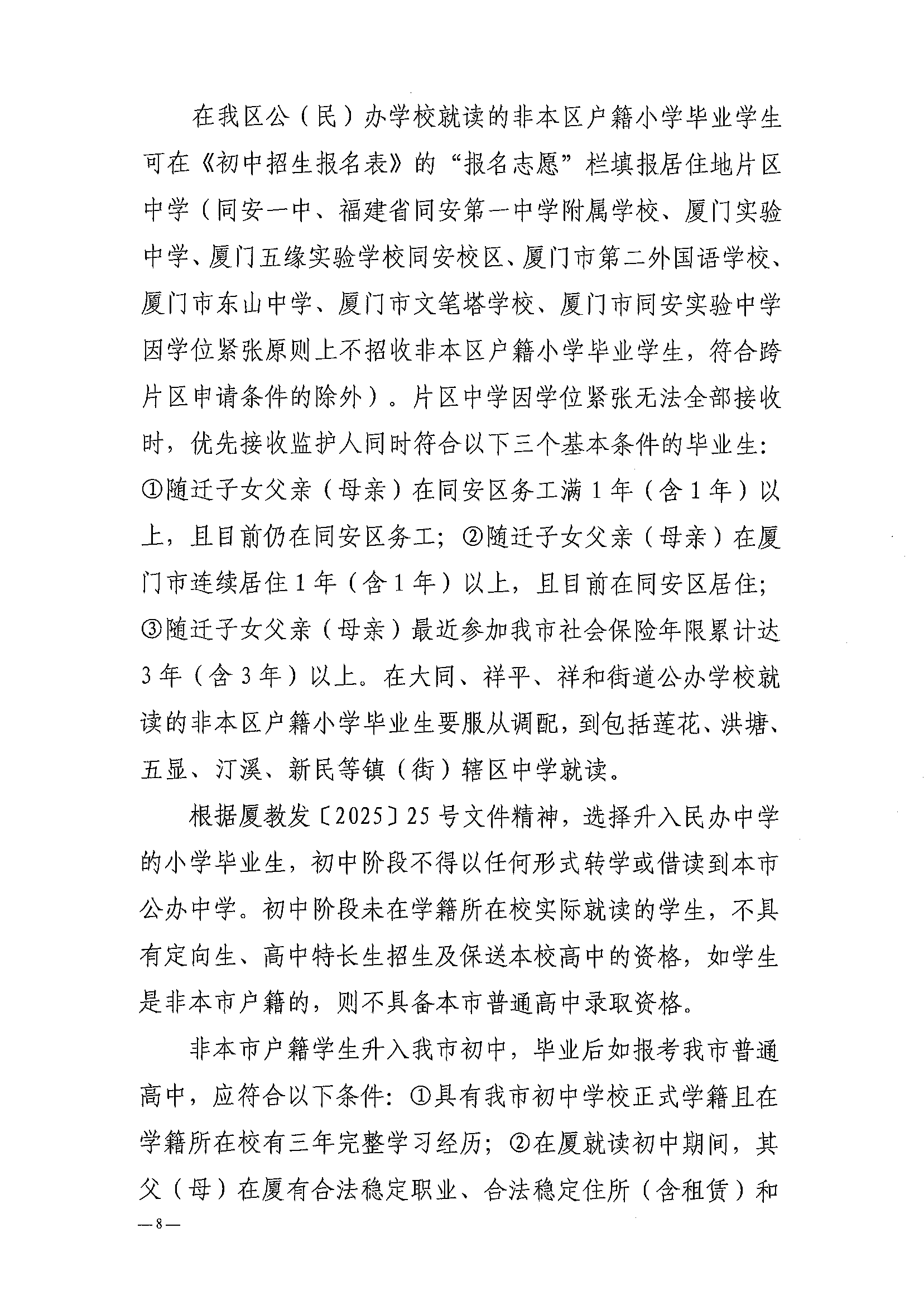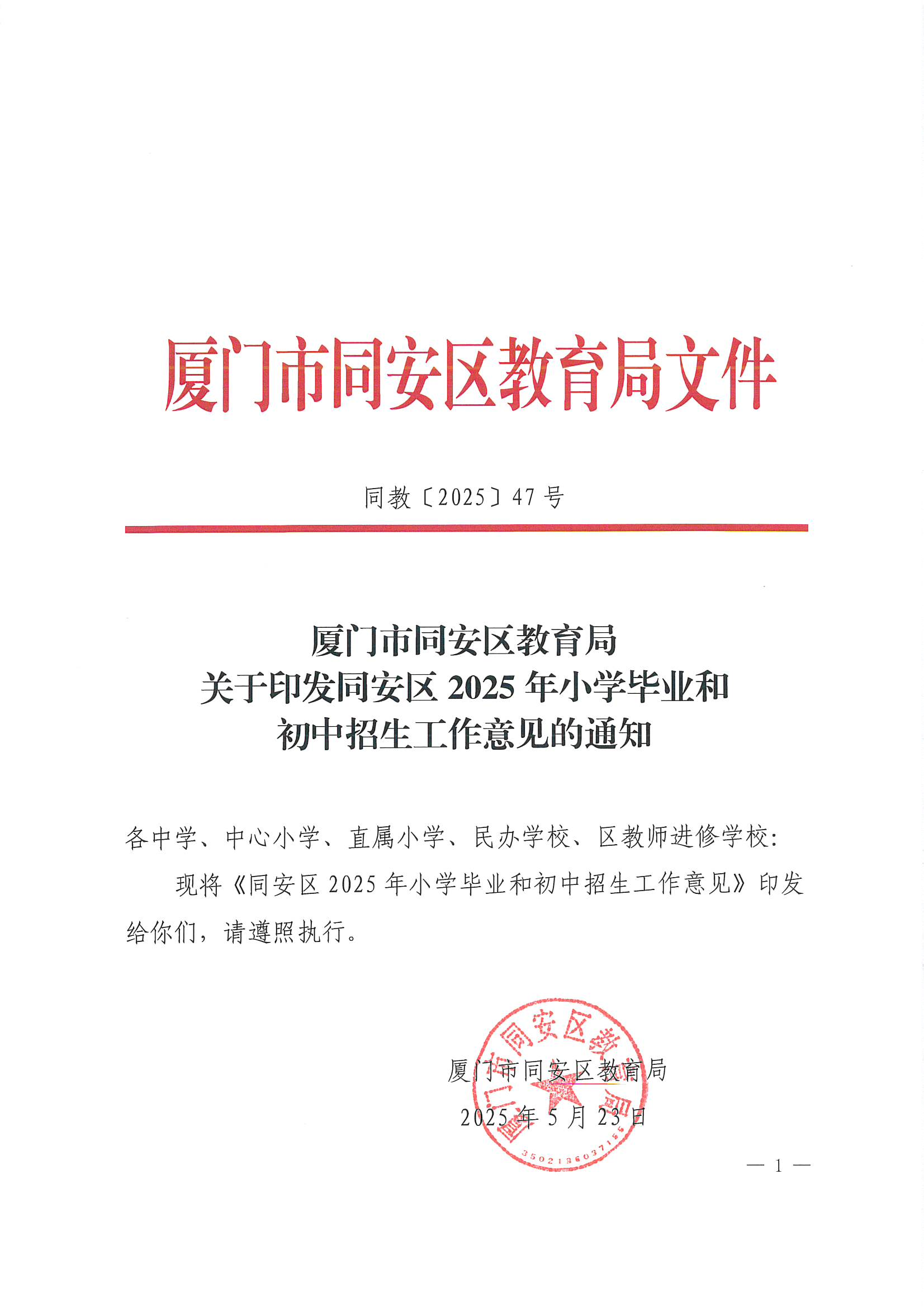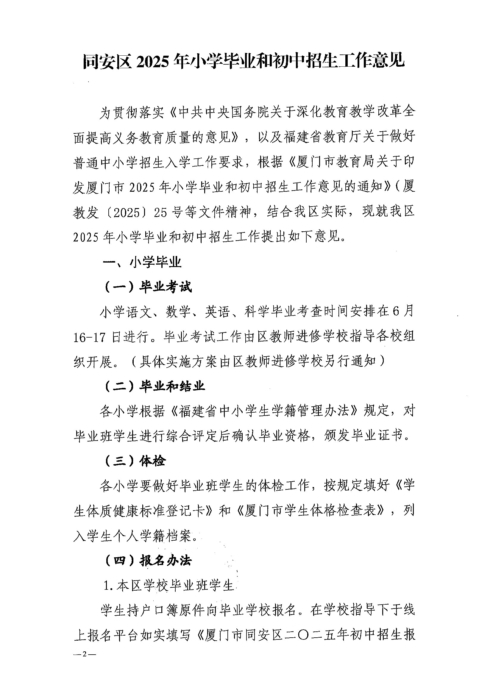 关于印发同安区2025年小学毕业和初中招生工作意见的通知